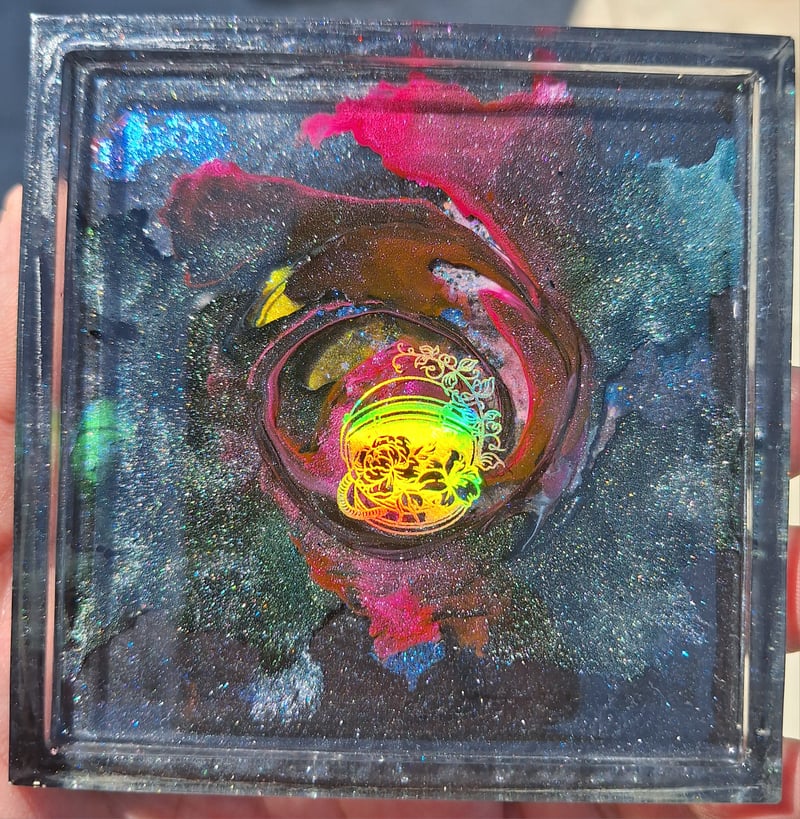 Alcohol ink, holofoil and black pigment powder in epoxy resin