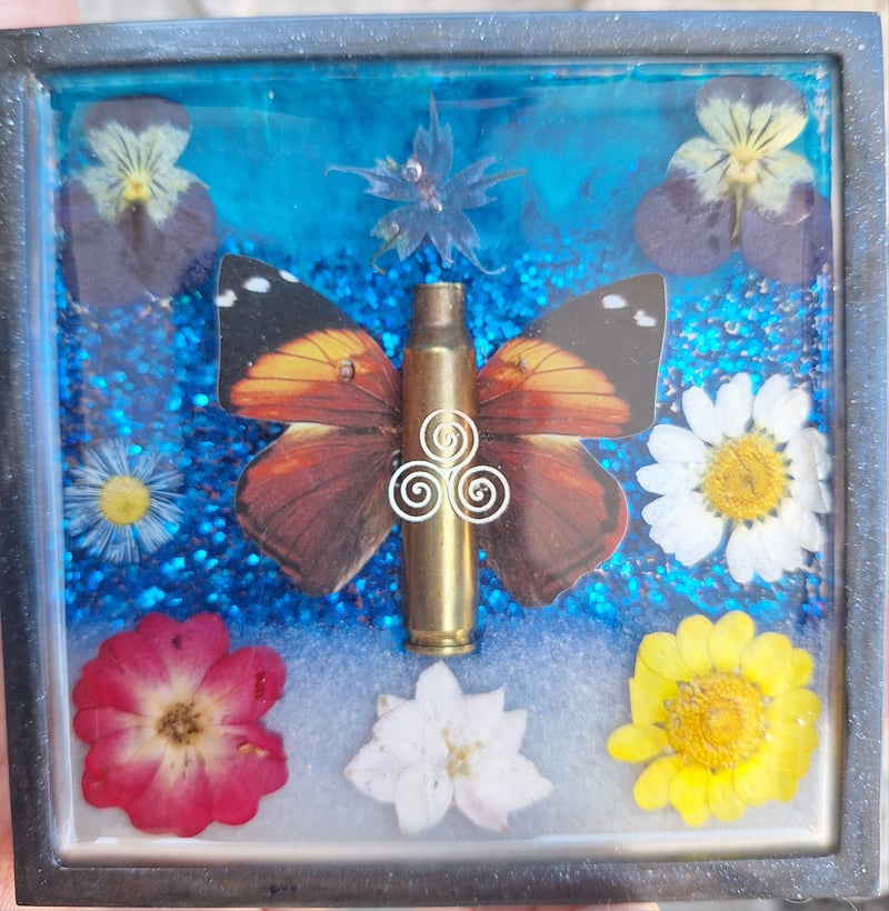 Plastic butterfly wings, bullet shell, flowers, blue glitter and sand inside epoxy resin