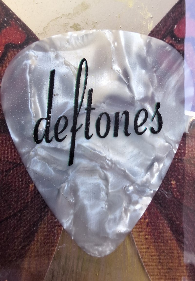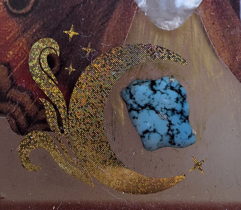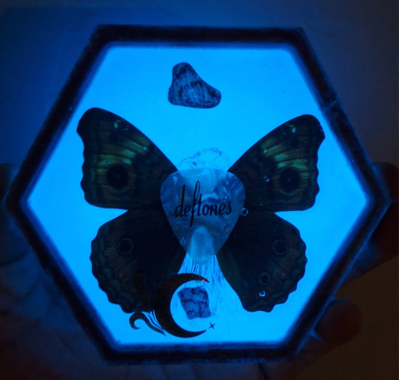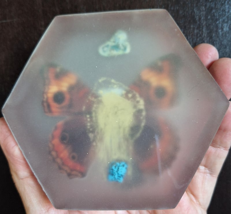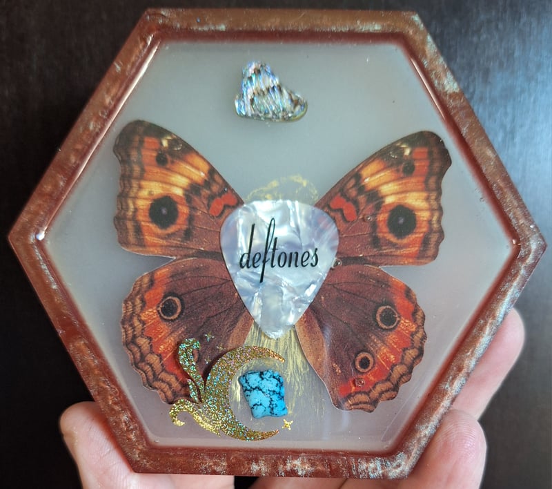 Plastic butterfly wings, gemstones, guitar pick, and holofoil inside epoxy resin. Border has color shifting brown/green pigment.