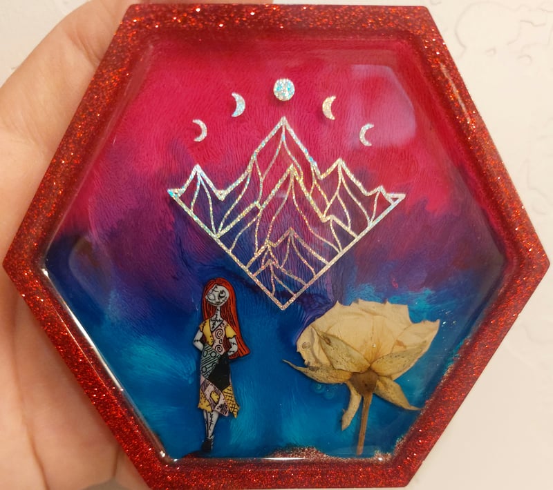 Figurine, holofoil, red glitter, and a real flower inside epoxy resin