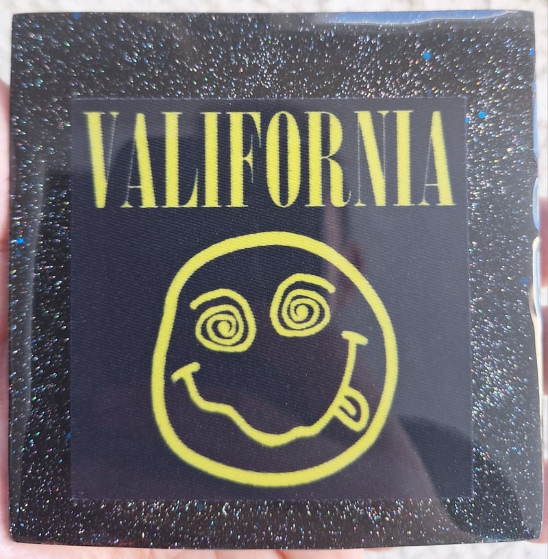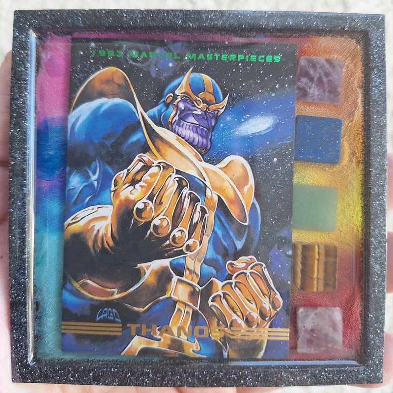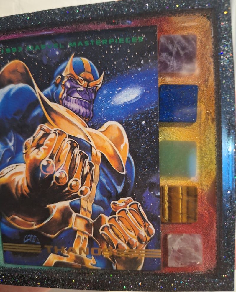 Marvel card, alcohol ink and gemstones in epoxy resin